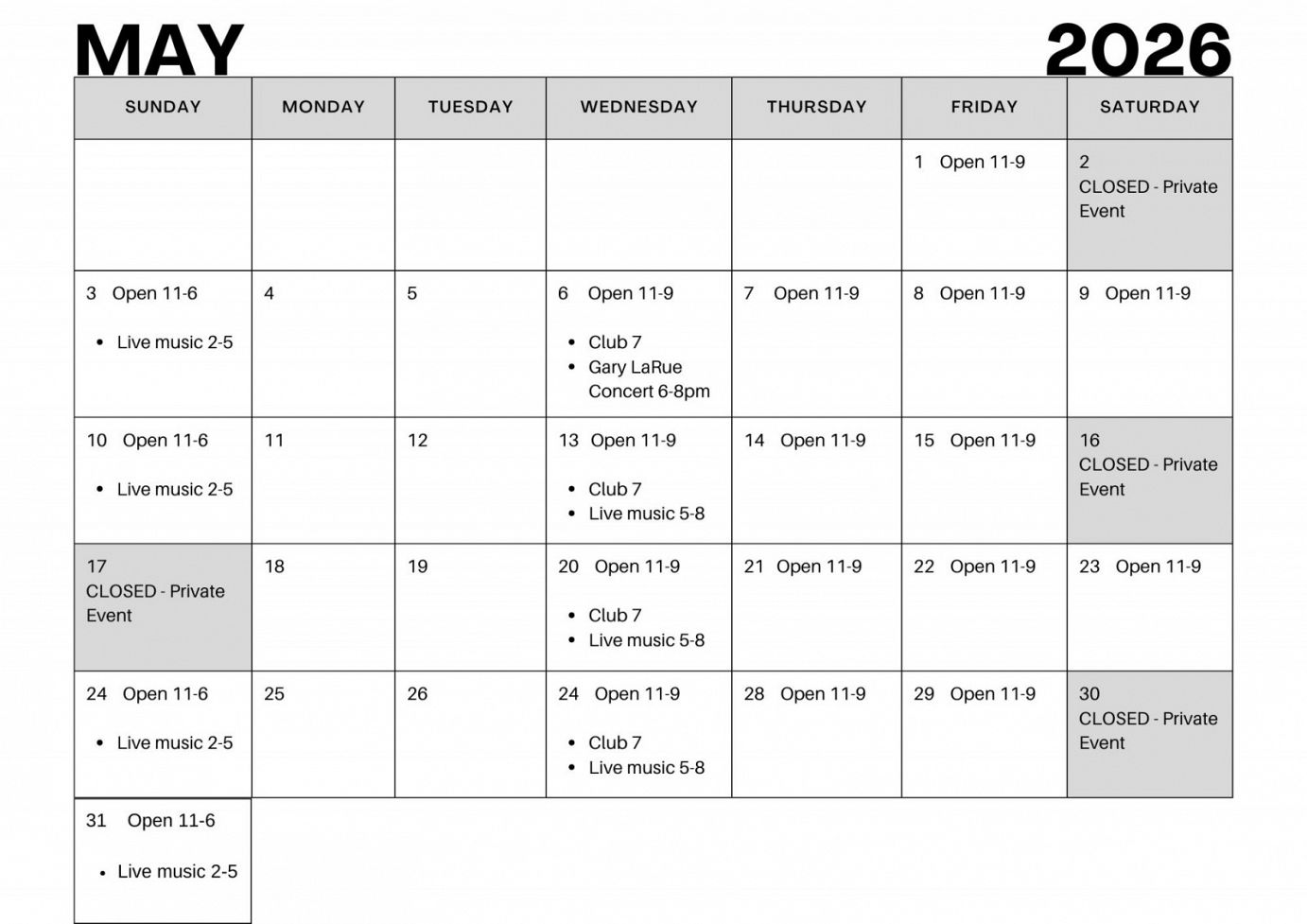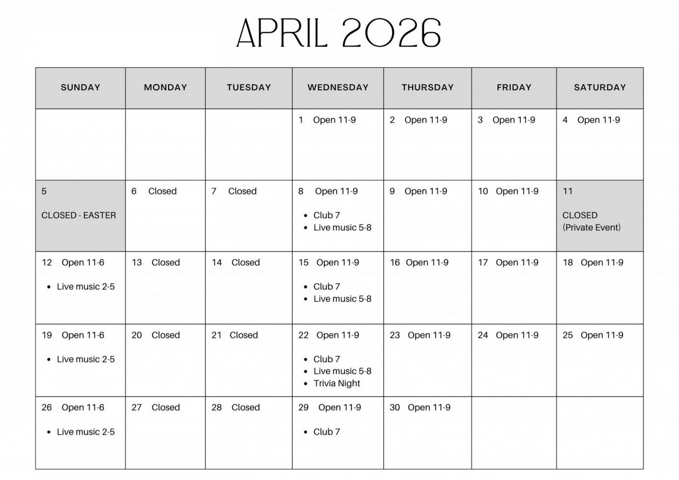 Wine Bar Hours & Full Calendar